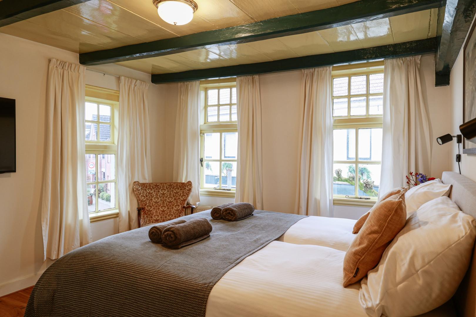 Wij bieden u vier comfortabele kamers waar de historische charme bewaard is gebleven. De kamers, met eigen sanitair, zijn licht, ruim en rustig gelegen. Alles wat u nodig heeft voor een heerlijk weekend of kort verblijf.