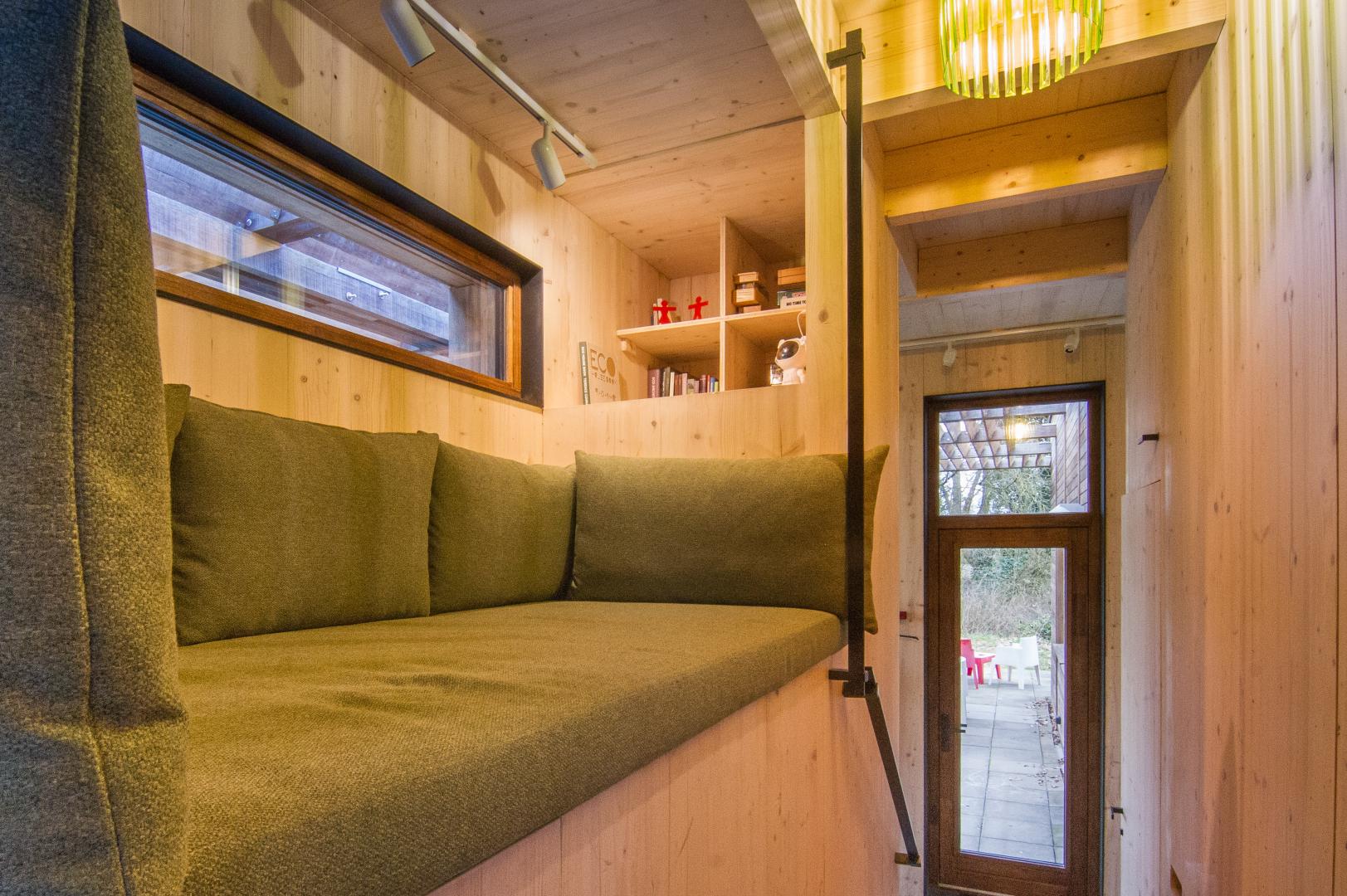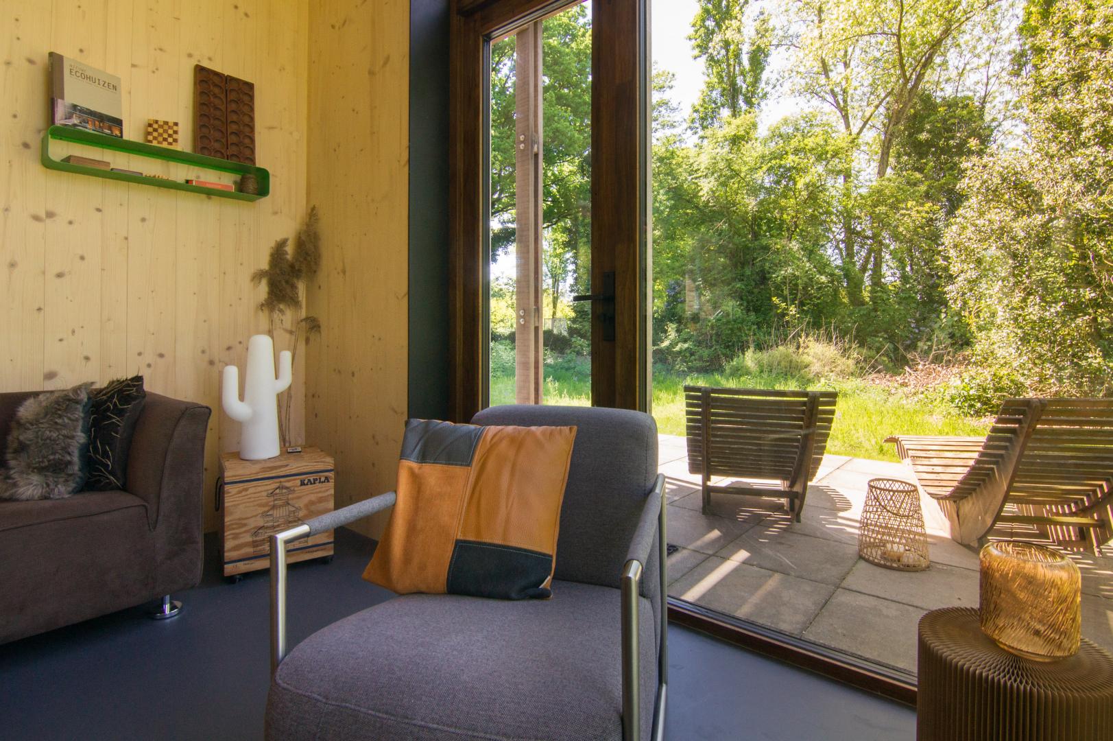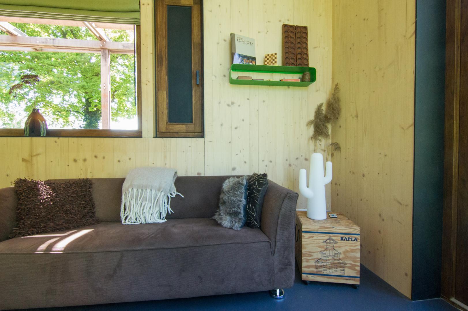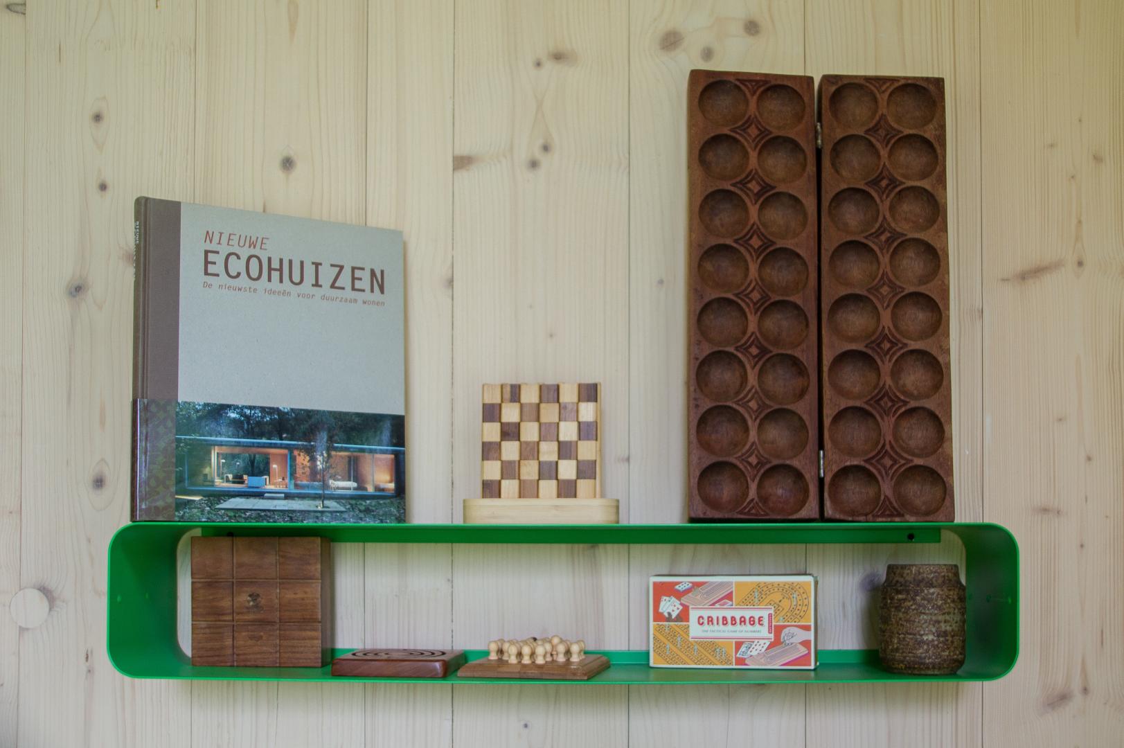 "In de gang van de bel-etage zit een grote nis waar je je even kunt terugtrekken om een boek te lezen, een goed gesprek te voeren of gewoon dromerig naar buiten te kijken. Hier staat ook een verzameling boeken over duurzame architectuur die ons geïnspireerd hebben om Paviljoen Esch te bouwen. Een spannende zoektocht hoe een stijlvol ontwerp te combineren met veel duurzaamheid en praktisch gebruik."